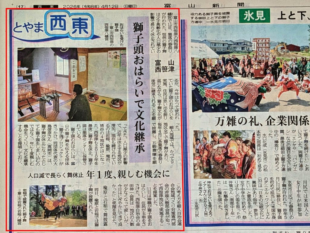 新聞記事によると、地区の人口減少により寂しさが増している中、獅子頭を祀ってお祓いを行ったことで住民が集まり、当時の思い出話に花が咲いたとのことです。